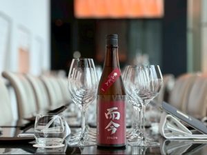 次に提供したのが、かつての而今のフラッグシップ、而今純米吟醸名張。ここには「甘鯛のかぶら蒸し/里芋・春菊・菊花/柚子香る銀あん・山葵」を合わせました。木屋正酒造が居を構える三重県名張の契約農家さんの山田錦を使用しています。和梨や白桃、固めのメロンを思わせる甘やかで繊細な香り。エントリーは和柑橘のフレーバーを伴った酸があり、中盤にふくらみが出てきて、かぶらの柔らかい甘さや里芋のねっとり感ときれいに同調しました。