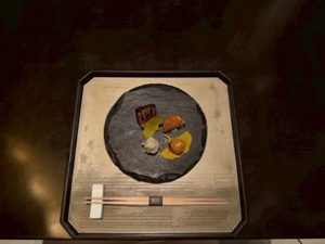 次は風花の定番のお醤油で提供しないお造り3種に、而今生酛有機山田錦火入れを。この有機山田錦は、訪問させていただいた時にテイスティングし、私も他の訪問者も思わず『おー!!!』と声が出た銘柄で、今回のイベントでどうしても入れて欲しいとリクエストした日本酒を「鰹藁タタキ 玉ねぎ・茗荷ダレ/白身入り酒ジュレ/烏賊 塩・酢橘」と合わせてお楽しみいただきました。この日本酒の特徴は、生酛×木桶×有機栽培がもたらすピュアさと複雑性という相反する魅力です。縦に伸びるような酸が、玉ねぎ・茗荷の香味野菜のアロマに寄り添い、烏賊のねっとりした甘さを引き立てます。白身の入り酒ジュレには少しだけ而今を使用しており(ぜいたくですよね)、旨味の相乗を舌で実感できるペアリングとなりました。