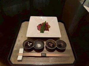 最後に提供したのが“而今特等雄町“ボトルもエチケットも本当に美しいです。ずっと見ていられるくらいにうっとりとしてしまう日本酒に合わせて、大西さんから事前の打ち合わせで「而今と合う」とリクエストをいただいておりました伊賀牛を。「伊賀牛炭火焼き/梨ダレ・松の実ダレ/丸十・蓮根・茄子・万願寺」梨の種の周りの心地よい苦み・うまみを伴った味わいを持つこの日本酒自体が梨のソースのようなイメージで伊賀牛と合わせられます。松の実のコクが日本酒自体の花の蜜のような上品な甘さと寄り添い、炭火香の伊賀牛をふんわり包む、まさに甘・旨・酸・苦が見事に整った立体感のあるペアリングになりました。「特等雄町は本当に希少。甘さに流されず、余韻に“芯”を残すことが大切」と大西さんは語ります。