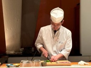去る10月13日、日本料理「風花」におきまして、世界が羨望するブルゴーニュの至宝 Domaine de la Romanee-ContiとDomaine Prieure Rochの正規輸入元として日本のファインワインマーケットに唯一無二のポートフォリオを展開しているFwinesさんよりGuillaume Laborde (ギヨーム・ラボルド)氏をお迎えし、Fwines取り扱いの両ドメーヌを含めた珠玉のラインナップとともに、ワインの美学、テロワールについて余すことなく語っていただくファインワインディナーを開催いたしました。そんなディナーの舞台となったのは、日本料理「風花」の鮨カウンター。8名様限定でのご案内となりました。この会が決まってからというもの、鮨料理長の小川と打ち合わせ、試作を何度も重ねました。通常こういったワインディナーの際には、当日お客様に提供するワインを職人にテイスティングしてもらって、料理を造っていくことが多いのですが、今回のワインに関しては事前にテイスティングしてもらうことができず、「恐らくこんな香りがあります」、「ワインのテクスチャーの核になるのはきめの細かさです」といったような想像の範疇でメニューを造っていきましたので、いつも以上に試行錯誤を繰り広げ、メニュー作成に長い期間を要しました。