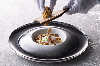 冬のシグネチャーコースでは、旬の高級食材である白トリュフを使った「白トリュフのチーズリゾット」(時価追加料金)をオプションで追加いただけます。さらに、ご希望に応じてコースメニューに含まれる全てのお料理にも、追加料金(時価)にて白トリュフのトッピングを承ります。ラグジュアリー感あふれるコラージュのシグネチャーコースに、芳醇で香り高い白トリュフを合わせることで、ひと皿ごとにさらに格別な表情が加わります。