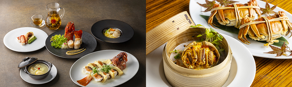 海の恵みを贅沢に味わう、陳シェフ特製のシーフードコースです。ライスペーパーで包みカリッと揚げたイセエビの春巻きは、一人様一尾をご用意。8時間かけて煮込んだ鶏白湯スープには、鮑と魚の浮袋をあしらい、深い旨みを引き出しました。上湯ソースでふっくら蒸し上げる旬魚も逸品です。さらに、10月中旬からはタラバカニに替わって、濃厚な味噌と繊細な甘みで知られる旬の「上海蟹」が登場しました。締めには、北海道産帆立を贅沢に使った炒飯を、卵白の餡とともに。海鮮料理を得意とする陳シェフのこだわりが詰まった一皿一皿をお楽しみください。