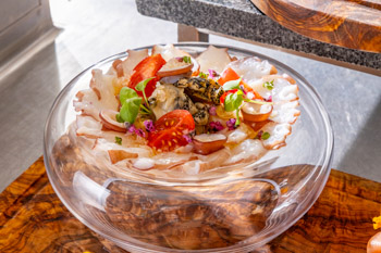 ミズダコのカルパッチョ 北海道完熟トマトとつぶ貝