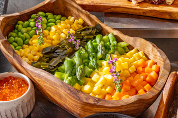 北海道産の昆布やアスパラガス、コーンなど色とりどりの食材を使用したコブサラダ。ビタミンやミネラルが豊富で夏の体を労わる栄養たっぷりの一品です。