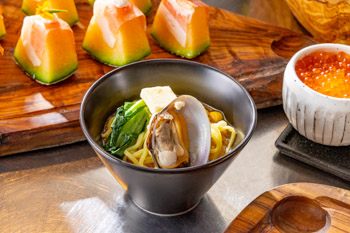 大粒の北海道産あさりが華やかな特製ラーメン。貝出汁と鶏ガラを使用した味噌ベースのスープに、あさりやコーンをトッピングした「北海道の幸」をご堪能ください。