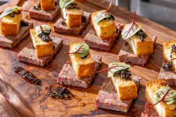 エゾシカの旨味が凝縮した一品。サクサクに焼いたフォカッチャはパテの上にのせて食感を生かし、トリュフ香るハニーソースを添えて深みのある味わいに仕上げました。