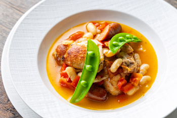 イタリアの郷土料理である鶏肉のトマト煮込みを、北海道育ちの鶏肉とチョリソーでアレンジ。ピリッとした辛味をアクセントに、夏らしくさっぱりと仕上げました。
