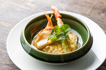 高級魚として知られる北海道産キンキの鱗焼きをメインに、カニのベニエと、出汁香るウニのリゾットを合わせた贅沢な一皿。レモンバターソースをかけ、コクの中に爽やかさを感じる味わいに。
