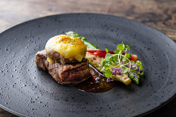 環境にこだわり丁寧に飼育された「豊穣の地 北の大地牛」をグリル。シイタケを器にした、マッシュポテトと北海道産カマンベールチーズのグラタンを添えました。