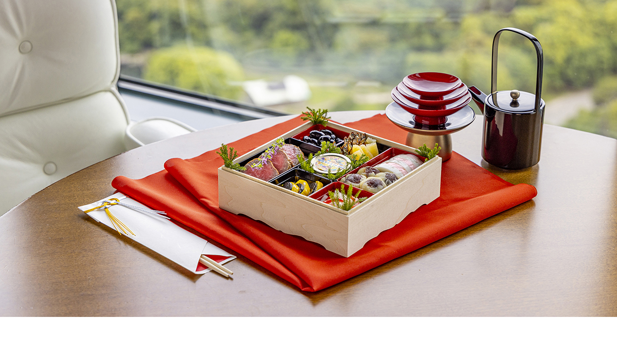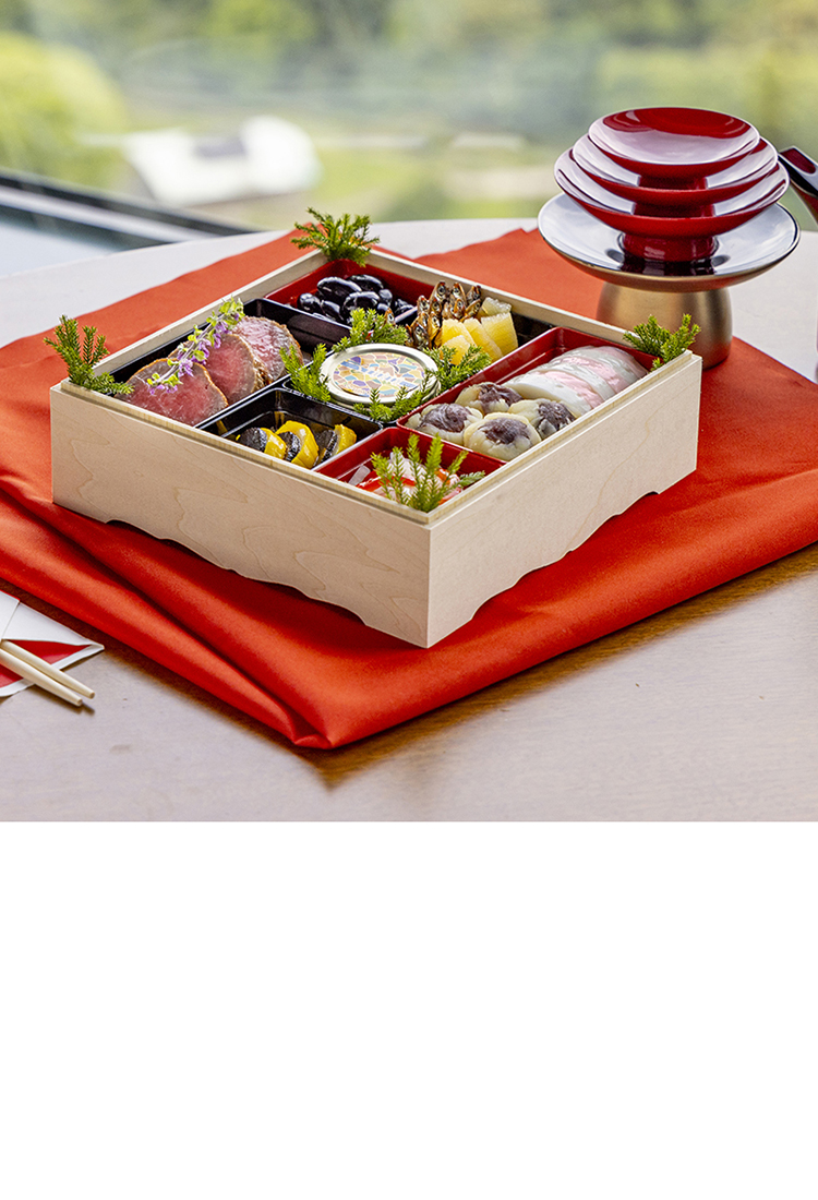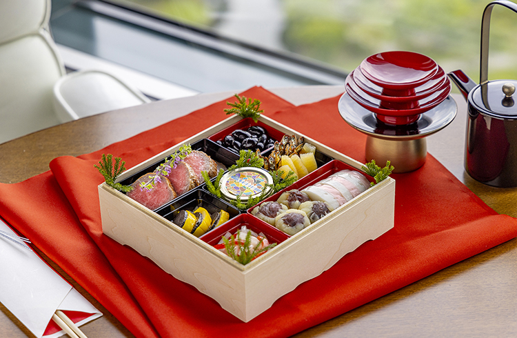 This limited-time add-on plan, available exclusively to guests staying at Conrad Tokyo on December 31 or January 1, offers a single-tier osechi box (for 2–3 people, featuring nine dishes) specially crafted by the hotel’s executive chef. The menu highlights premium ingredients and refined flavors, blending Japanese and Western traditions with selections such as black soybeans, candied sardines, cured herring roe, red and white namasu and kamaboko, chestnut sweet potato, wagyu roast beef, king crab brandade, scallops with truffle, and caviar pancakes.