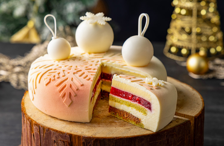 雪に包まれたホワイトクリスマスをテーマにしたムースケーキ。ホワイトチョコレートムースの中に、タヒチ産バニラを使用したクレームブリュレ、いちごのジュレ、ピスタチオ風味のスポンジ、そして薄く焼いたサクサクのクレープ生地を重ねました。いちごの甘酸っぱさとピスタチオのコクを包み込むようになめらかなクレームブリュレが溶け合い、メリハリのある味わいに。ホワイトチョコレートのオーナメントを飾ってご用意いたします。