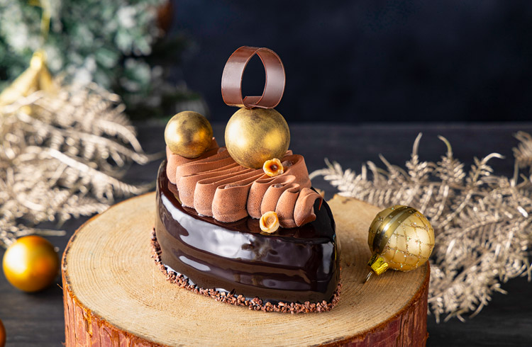 クリスマスツリーに見立てたチョコレートガナッシュに、ゴールドが上品なチョコレートオーナメントをあしらった、フランス語で「モミの木の飾り」を意味するチョコレートケーキ。ダークチョコレートの酸味とオレンジのアクセントをほど良く効かせたチョコレートムースの中に、チョコレート生地とカラメリゼしたヘーゼルナッツのムースを重ね、濃厚で深みのある味わいに仕上げました。