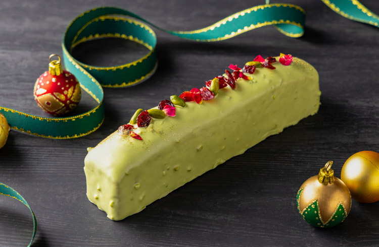 ピスタチオとクランベリーが好相性のパウンドケーキ。生地には2種類のピスタチオペーストを、表面のチョコレートには刻んだピスタチオを加えることで、ナッツのふくよかなを香りを引き立て、奥行きのある味わいに仕上げました。キルシュと蜂蜜でコンポートしたクランベリーを練り込み、瑞々しさと甘酸っぱいアクセントをプラスした、細部にわたるシェフのこだわりもお楽しみください。