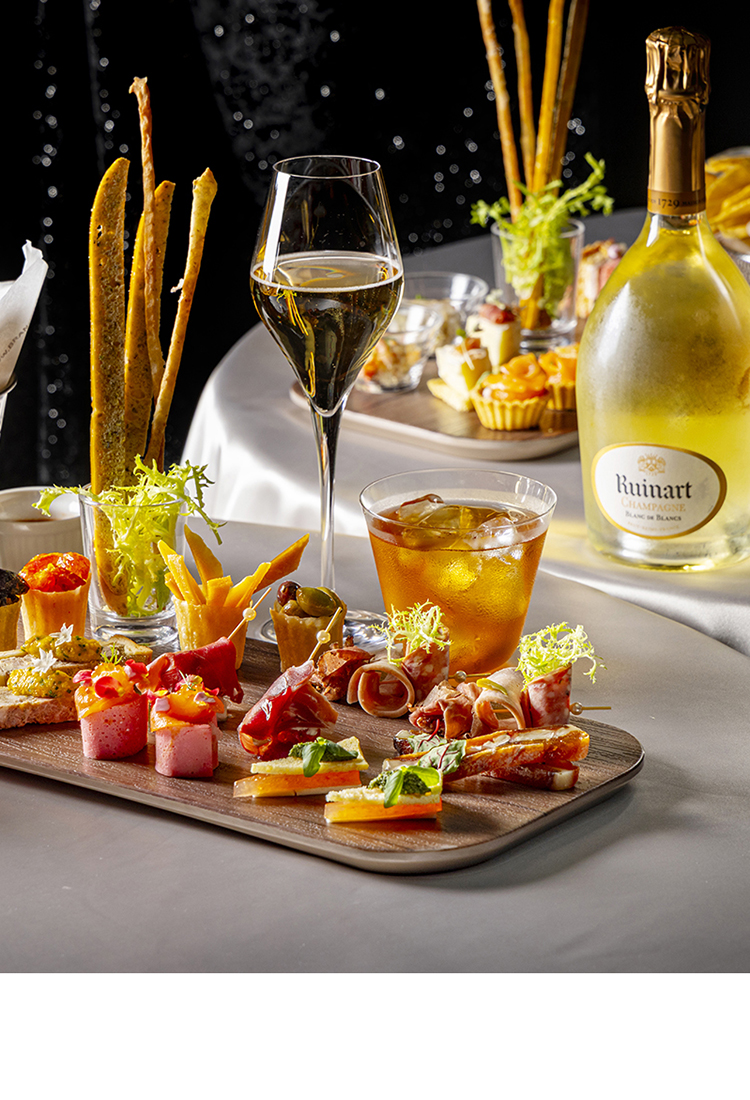 眼下にレインボーブリッジと東京湾の煌めく夜景が広がるバー&ラウンジ「トゥエンティエイト」では、世界最古のシャンパーニュ・メゾン、「ルイナール」とコラボレーションしたカウントダウンパーティーを開催いたします。メゾンを代表する「ブラン・ド・ブラン」のフリーフローに加え、コンラッド東京特製のフィンガーフード、そしてバンドやDJによる 生演奏をお楽しみいただけます。スタンディングエリアで音楽に身をゆだねたり、テーブル席にてゆったりと過ごしたり、お好みのスタイルで華やかに新年をお迎えください。